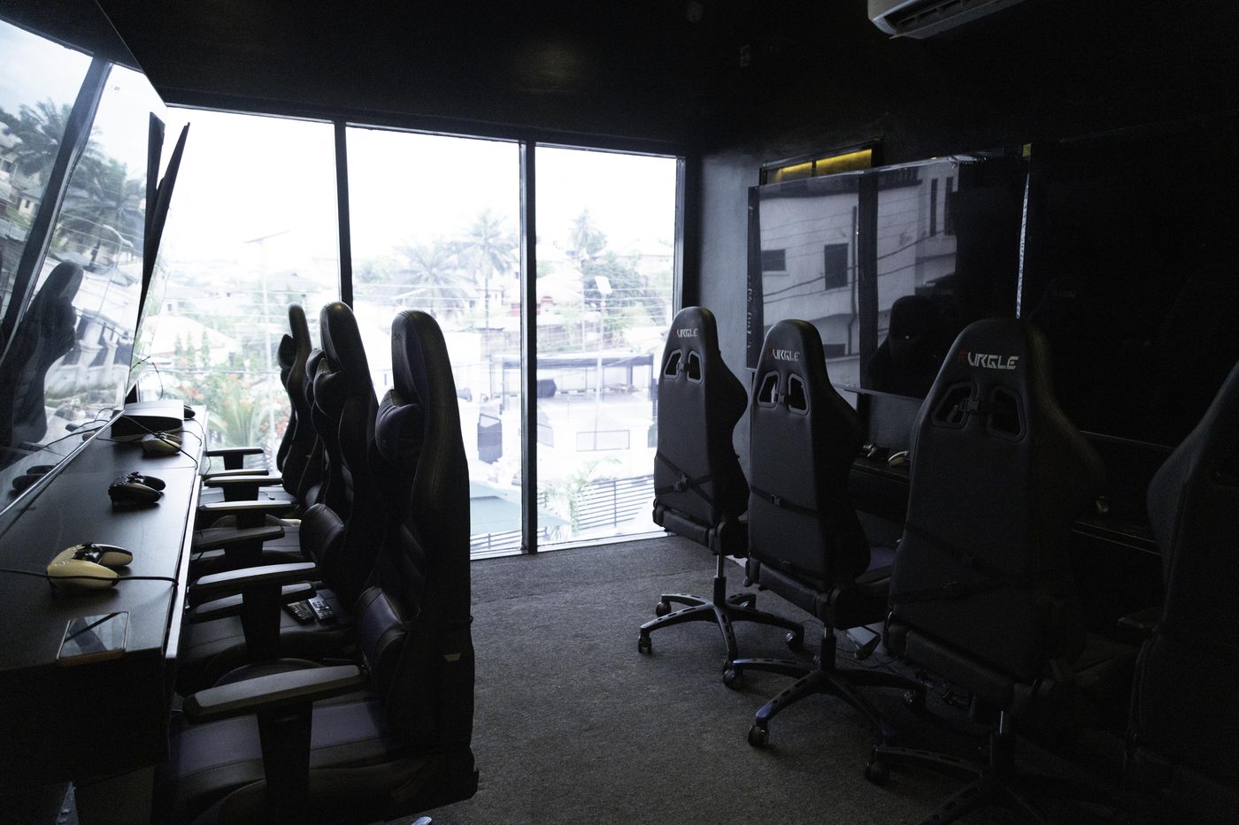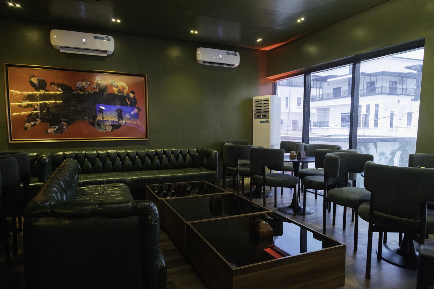 Double-height ceilings with floor-to-ceiling windows overlooking the city